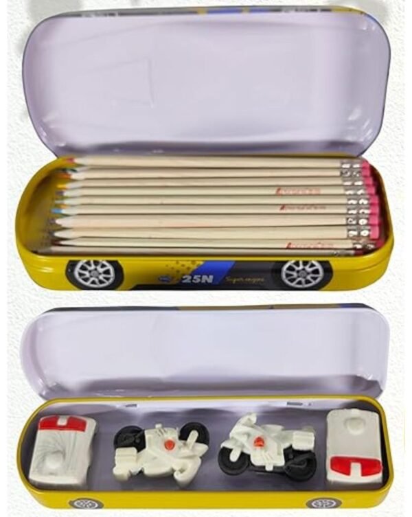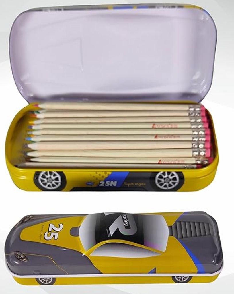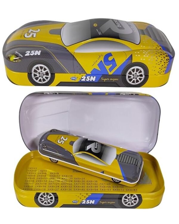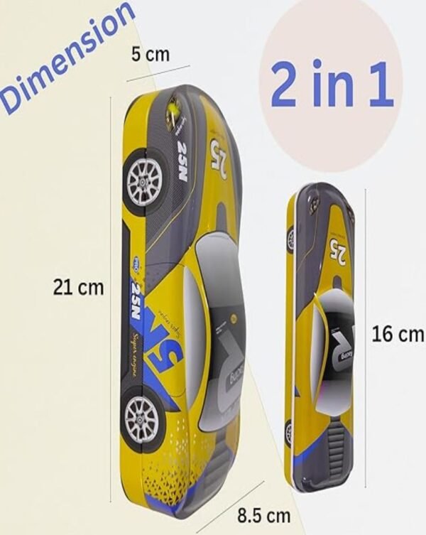 It is an stylish metal car shaped pencil box. 2 in 1 (Car shaped box)